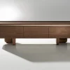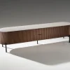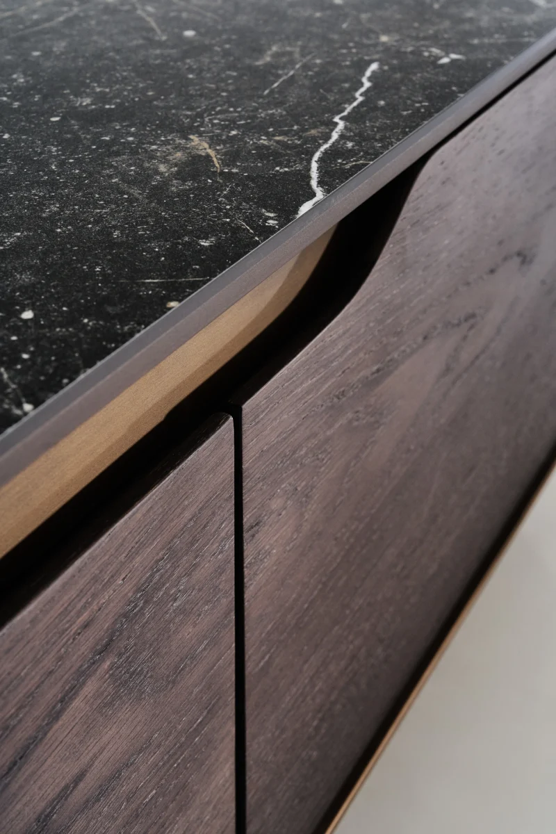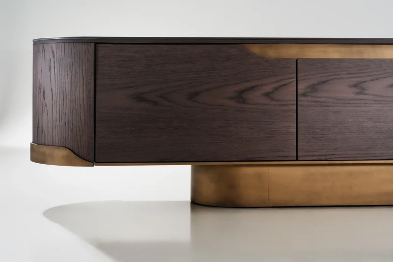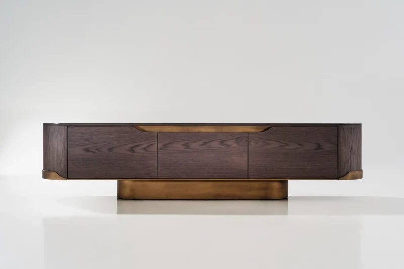 To “Infinity” είναι κάτι περισσότερο από ένα έπιπλο τηλεόρασης — είναι ένα διαχρονικό κομμάτι σχεδιαστικής αρμονίας. Η καμπυλωτή του μορφή, σε συνδυασμό με τις μπρονζέ λεπτομέρειες και τη χαμηλή, καμπυλωτή βαση, του χαρίζει κομψότητα και ελαφρότητα, σαν να αιωρείται στον χώρο. Το σκούρο ξύλο της πρόσοψης δένει ιδανικά με τις μεταλλικές μπρονζέ πινελιές, δημιουργώντας έναν ζεστό και ταυτόχρονα εκλεπτυσμένο διάλογο μεταξύ υλικών και υφών.