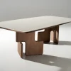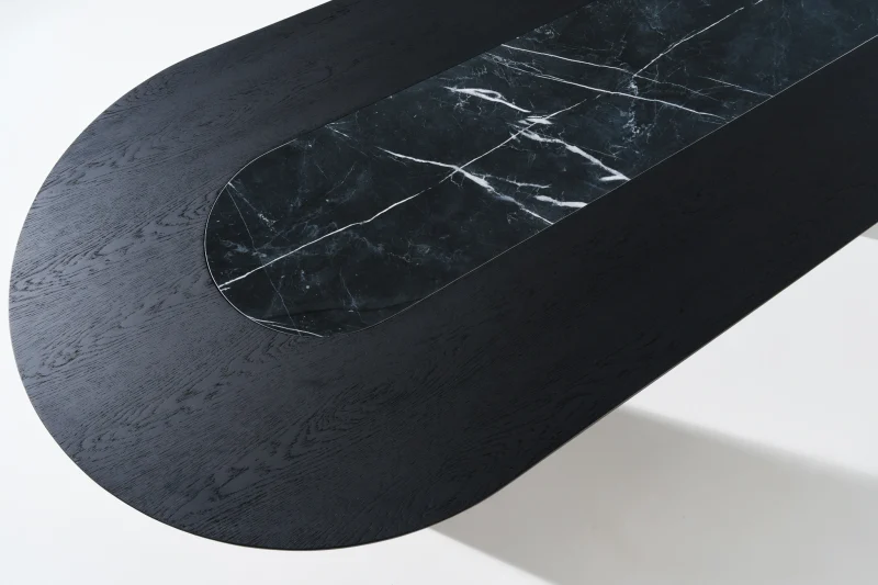Το τραπέζι “BARY” ενώνει δύο υλικά με δυνατή προσωπικότητα σε μια εκλεπτυσμένη αρμονία. Οι δύο καμπυλωτές μεταλλικές βάσεις σε μαύρο ματ φινίρισμα προσδίδουν μια ανάλαφρη αλλά στιβαρή στήριξη, ενώ το οβάλ καπάκι από φυσικό δρύ εχει στο κέντρο του ενσωματωμένο κεραμικό στοιχείο σε μαύρο φόντο με λευκά νερά που δημιουργεί ένα θερμό και φιλόξενο σύνολο .