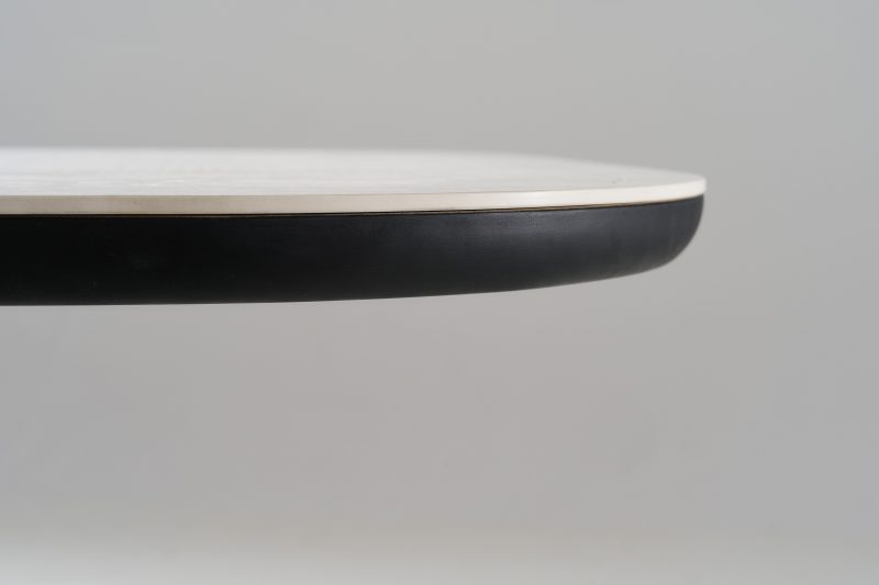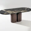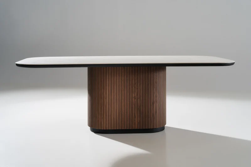 Η επιφάνειά του από κεραμικό Travertino αποπνέει φυσική πολυτέλεια και ανθεκτικότητα ενώ η βάση του τραπεζιού ξεχωρίζει για την καμπυλωτή της γραμμή και την επένδυση με κάθετα πηχάκια σε ζεστό χρώμα καρυδιάς, προσδίδοντας βάθος και υφή στον σχεδιασμό.