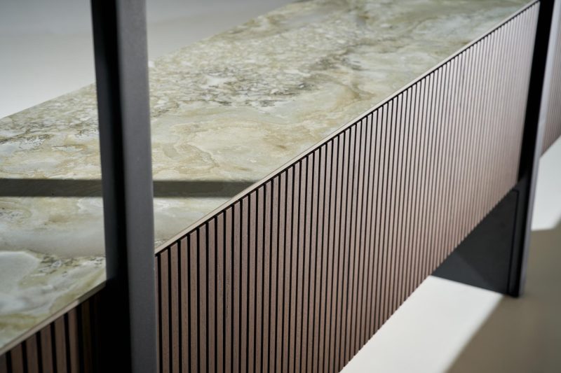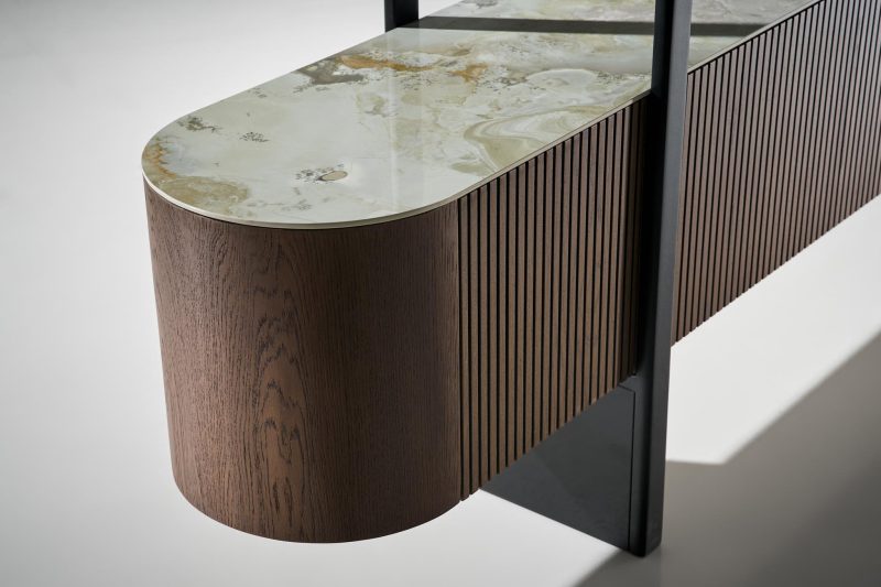 Η “Noir” είναι μια βιβλιοθήκη που ισορροπεί ανάμεσα στη φυσική πρώτη ύλη και τον σύγχρονο σχεδιασμό. Το καμπυλωτό της σώμα αγκαλιάζει τον χώρο, δημιουργώντας μια αίσθηση ροής και ηρεμίας. Τα τρία ντουλάπια, επενδυμένα με κάθετα δρύινα πηχάκια, προσθέτουν υφή και χαρακτήρα, αναδεικνύοντας τη ζεστασιά του ξύλου. Ανάμεσά τους, τρία μαύρα λακαριστά ράφια και κατακόρυφες στήλες προσφέρουν γεωμετρική ισορροπία και έντονη αντίθεση, ενώ το κεραμικό πίσω πλαίσιο σε γήινες αποχρώσεις ολοκληρώνει το σύνολο με μια φυσική αίσθηση.